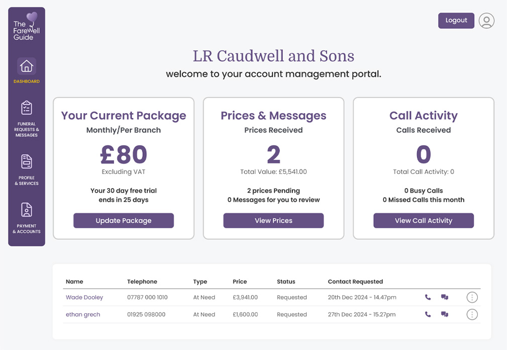 You can easily manage funeral requests by logging into your Funeral Director Portal, where you'll find an overview of all enquiries, funeral plans, and contact details, allowing you to stay connected and organised.