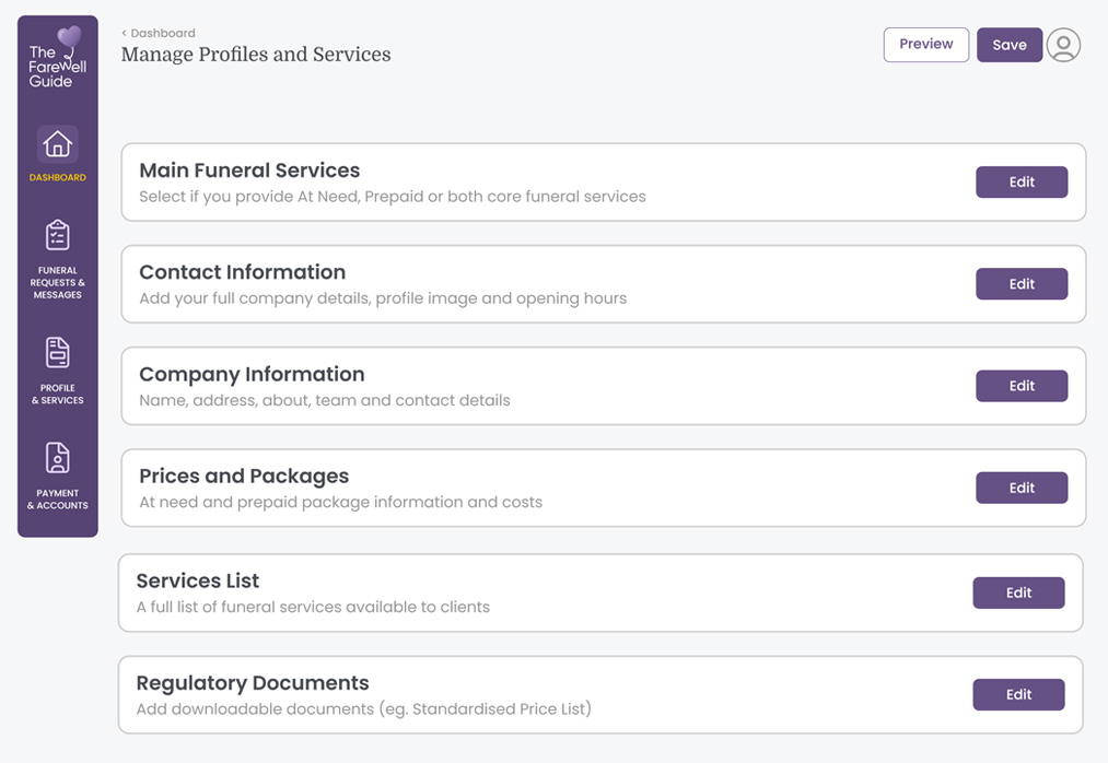 The Farewell Guide was created to help individuals navigate the funeral planning process by providing unbiased, straightforward information, free of charge. Whether planning in advance or at the time of need, our tools allow users to store and share end-of-life wishes and connect with trusted local funeral providers.