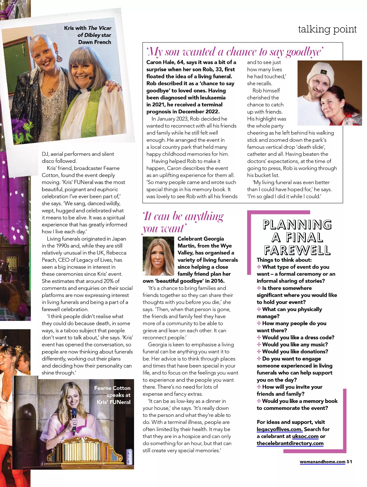 The September 2023 issue of Woman & Home magazine featured an article about living funerals. Rebecca Peach (founder of The Farewell Guide) talked about our audience's interest in this type of event.